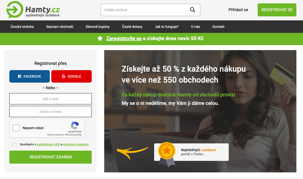 V roce 2016 se připojilo k českým cashbackovým portálům Hamty s cílem nabízet nejštědřejší odměny ze všech. Štědrost je však nezvykle podmíněna – portál si účtuje poplatek za roční členství. Ten činí 0 až 240 Kč v závislosti na tom, jak moc přes portál utratíte. Je strháván postupně z vašich schválených odměn, nikdy tedy nic nedoplácíte a zároveň nikdy nezaplatíte víc než 240 korun za celý rok. V nejhorším případě budou tedy vaše výsledné odměny podobné jako u konkurenčních portálů. Hamty nemá mobilní aplikaci, má ale slevové kupony a odměny můžete vybírat již od 1 Kč.
